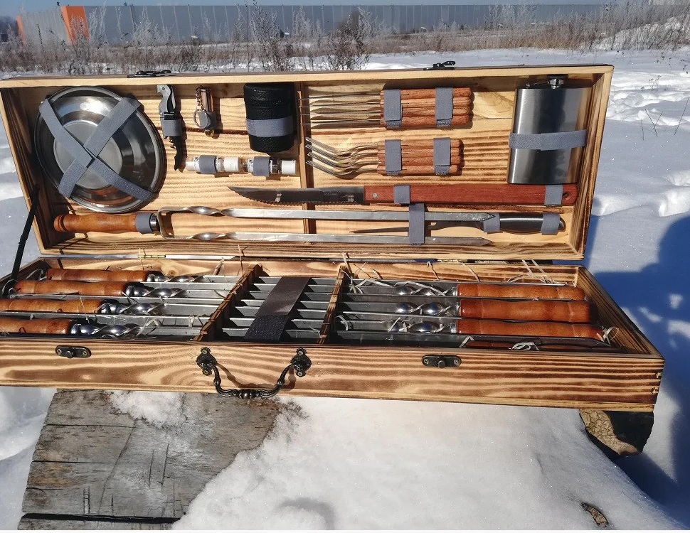 Шампура, двойной шампур, вилка для снятия мяса, нож, фляга, рюмки, вилки, ложки, штопор, зажигалка, набор для специй