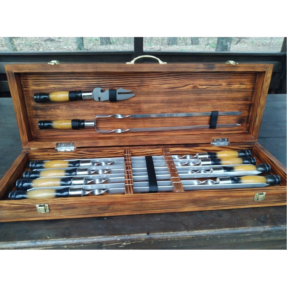 Шампура и аксессуары упакованы в деревянный кейс ручной работы, что придаёт подарку еще большую ценность и премиальность.