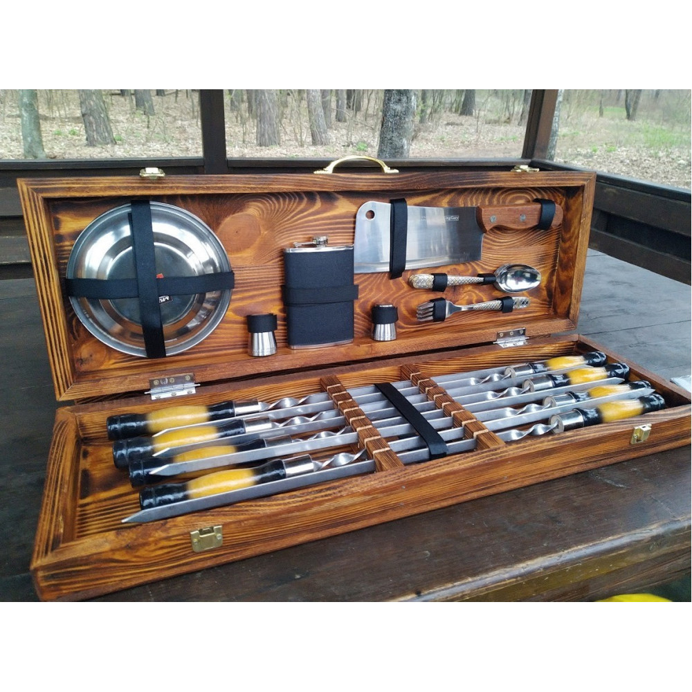 Шампура и аксессуары упакованы в деревянный кейс ручной работы, что придаёт подарку еще большую ценность и премиальность.
