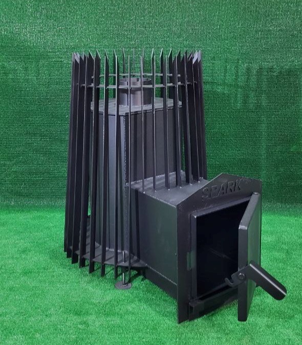 - Печь для бани каменка с функцией подачи пара. В основе конструкции предусмотрена специальная паровая пушка: в процессе подачи воды через воронку поступает мелкодисперсный пар, мягкий для дыхания человека. Также, имеется вместительный зольник для пепла, колосник сменного типа. Чтобы установить печь на любой поверхности (даже на неровной), модель была укомплектована ножками с возможностью регулировки. В процессе эксплуатации используют поленья длиной до 50 см, камни – порядка 130 кг. Дымоход 120 мм.