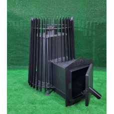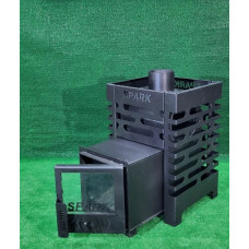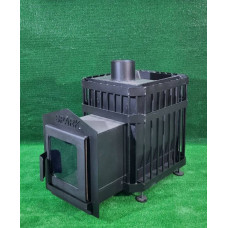- Печь для бани каменка с функцией подачи пара. В основе конструкции предусмотрена специальная паровая пушка: в процессе подачи воды через воронку поступает мелкодисперсный пар, мягкий для дыхания человека. Также, имеется вместительный зольник для пепла, колосник сменного типа. Чтобы установить печь на любой поверхности (даже на неровной), модель была укомплектована ножками с возможностью регулировки. В процессе эксплуатации используют поленья длиной до 50 см, камни – порядка 130 кг. Дымоход 120 мм.