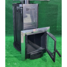 - Печь для бани каменка со стеклом. В этой конструкции было предусмотрено термостекло на дверцах, которое не деформируется под воздействием высоких температурных показателей. В конструкции также имеется колосник сменного типа, зольник выдвижной для пепла. Оптимальная длина поленьев достигает 40 см, а количество камней – порядка 80 кг. Дымоход 120 мм.