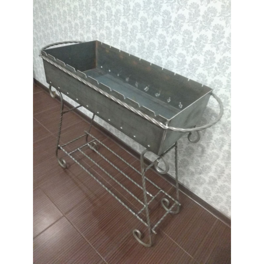 Жаровня розрахована на 10 шампурів. Жаровня укріплена трубою жорсткості. Внизу є полиця для дров.