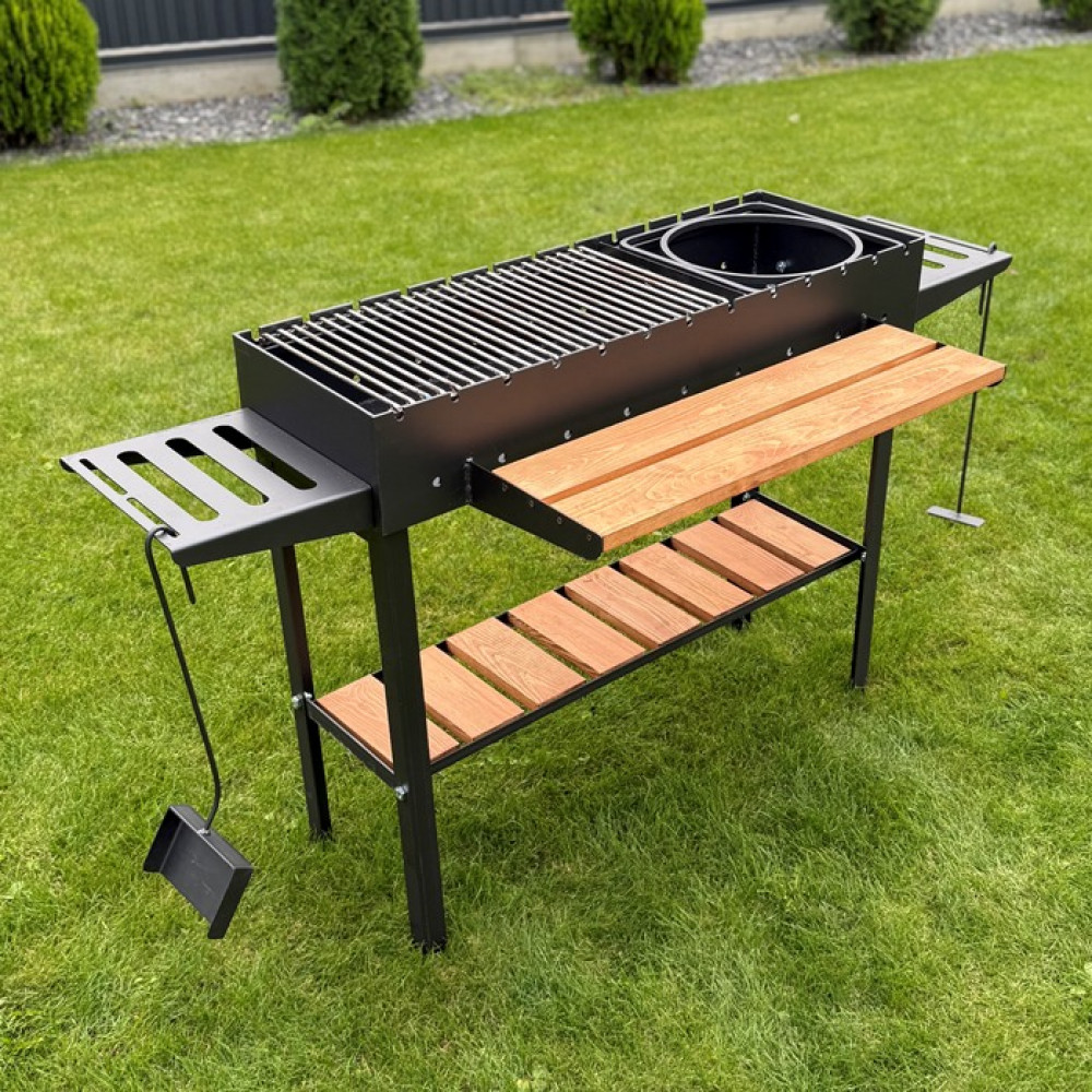 решітка-гриль, підставка під казан, перегородка для жаровні, бокові столики, передня полиця, совок, кочерга