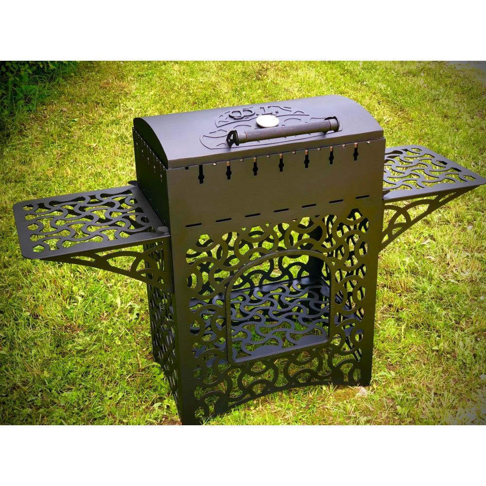 Мангал укомплектований знімними бічними столиками і дровницей.