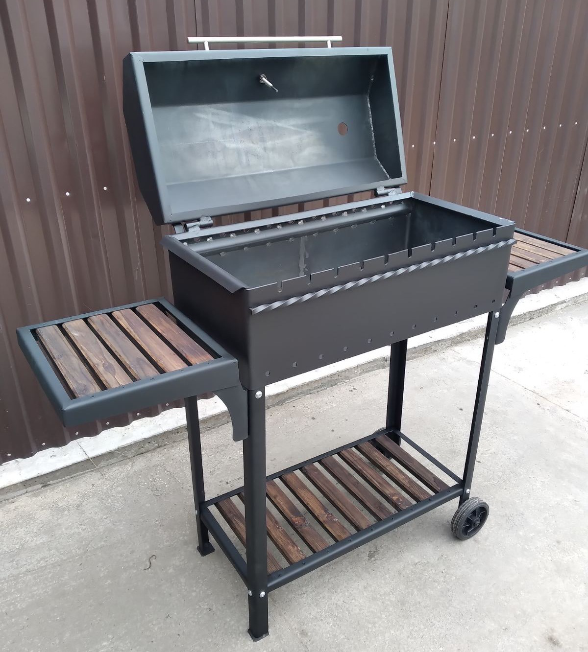 Жаровня виготовлена з металу 3 мм і посилена по периметру квадратом 10 * 10 мм.