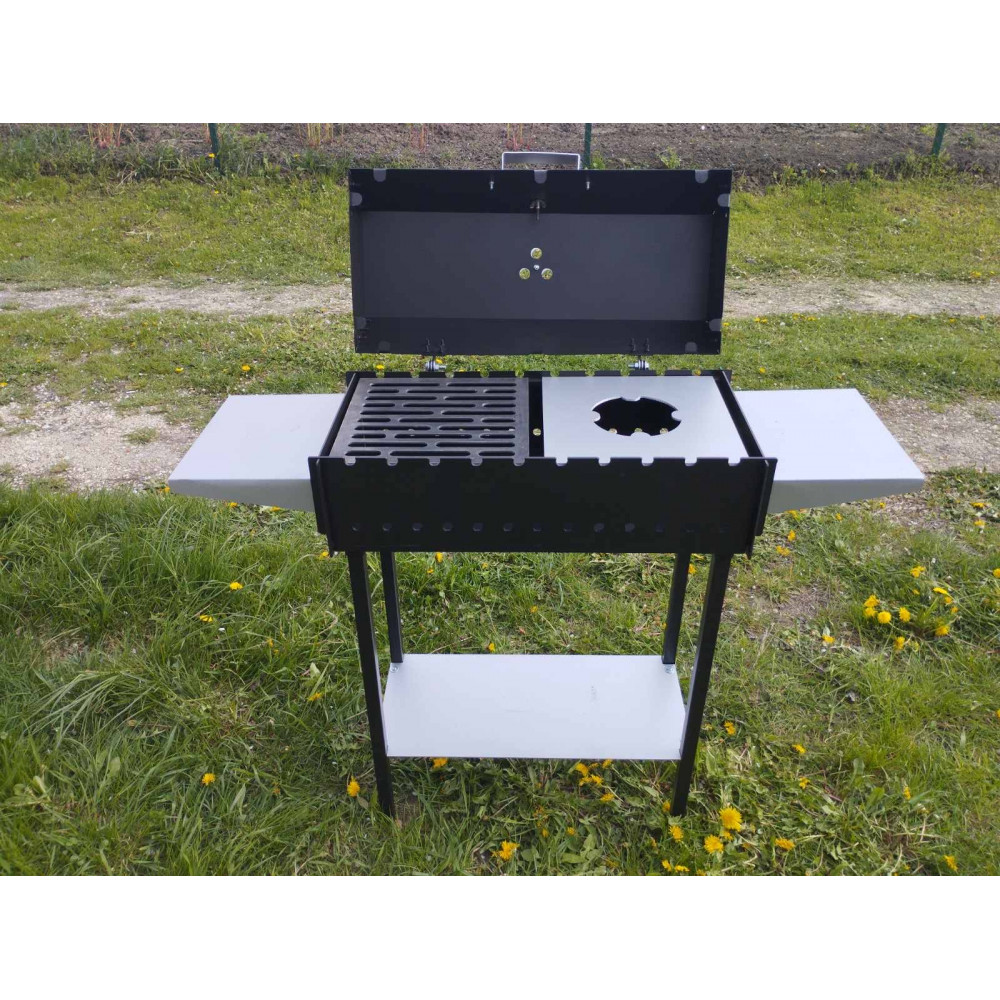Мангал обладнаний двома бічними столиками, обидва знімні.