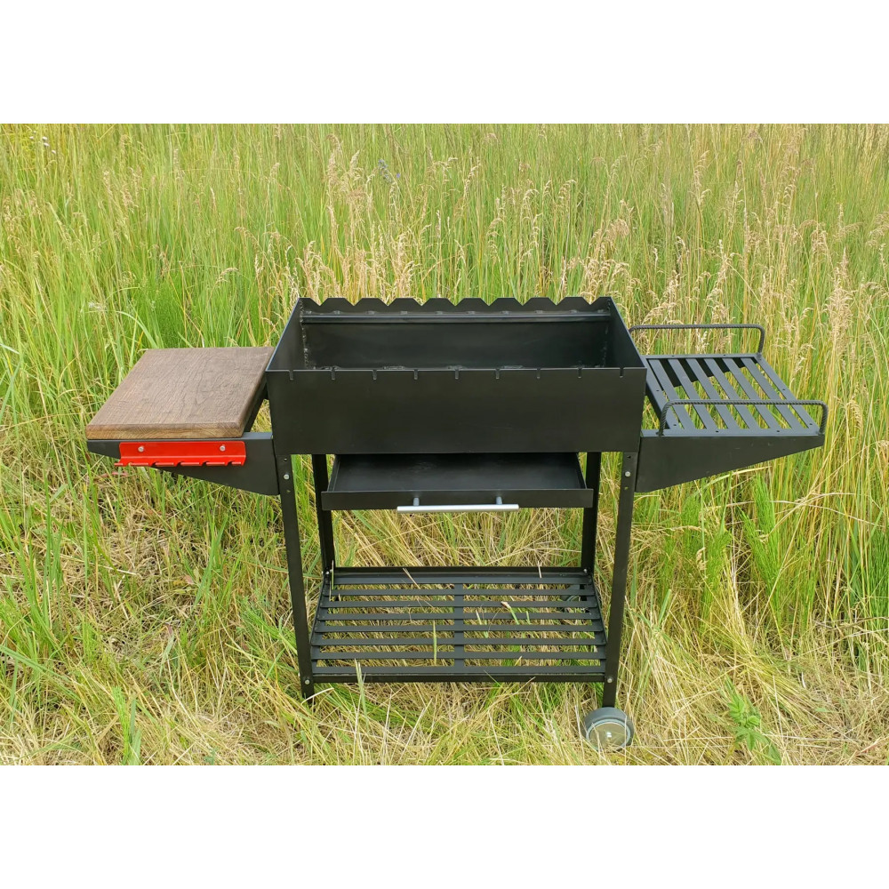 Завдяки коліщатам може зручно мандрувати на невеликі дистанція. Має ручки для переноски. Ніжки та полочки зйомні, тож перевозити мангал можна в будь-якому авто.