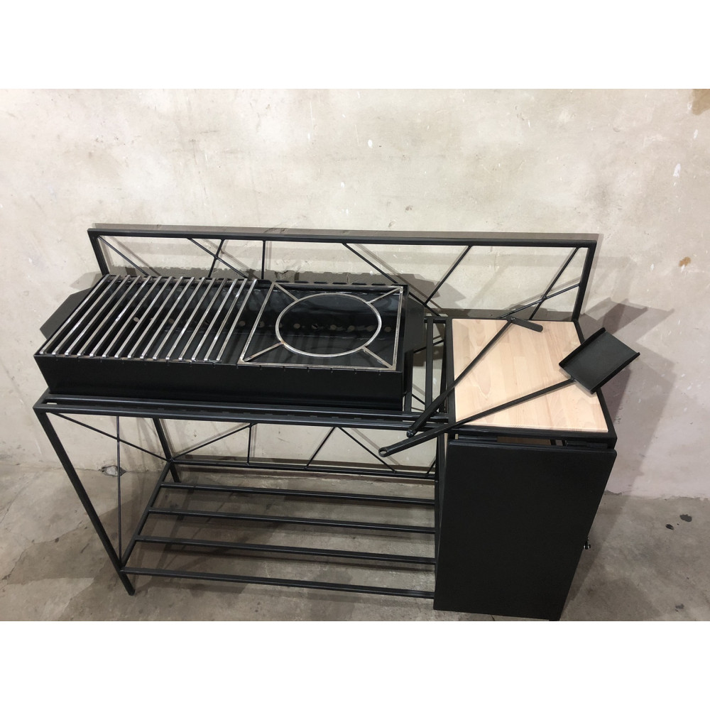 Мангал обладнаний розкладним столиком – його можна підняти і у вас буде повноцінний стіл для підготовки продуктів чи сервірування страв. Він також легко складається.