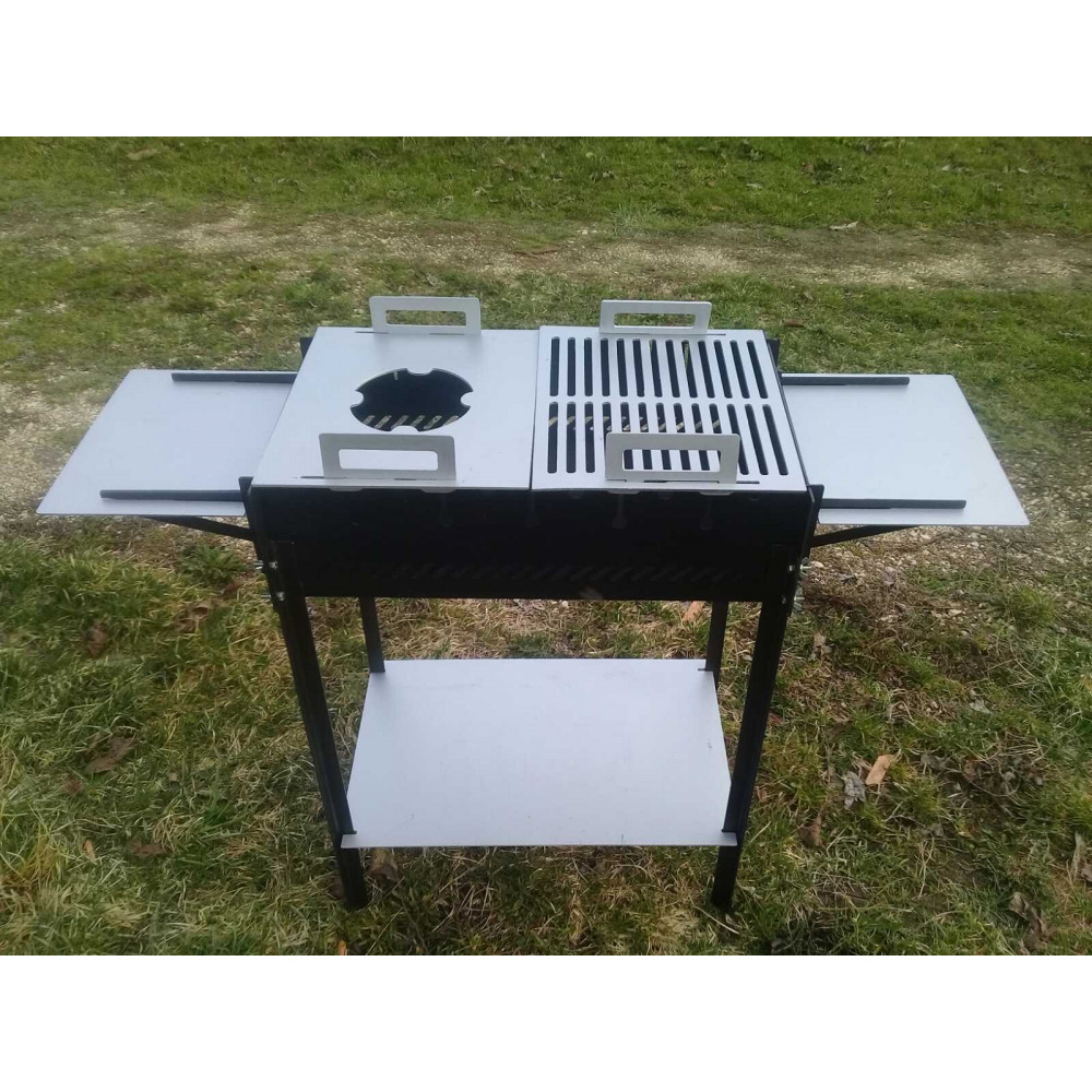 Мангал обладнаний двома бічними столиками, обидва знімні.