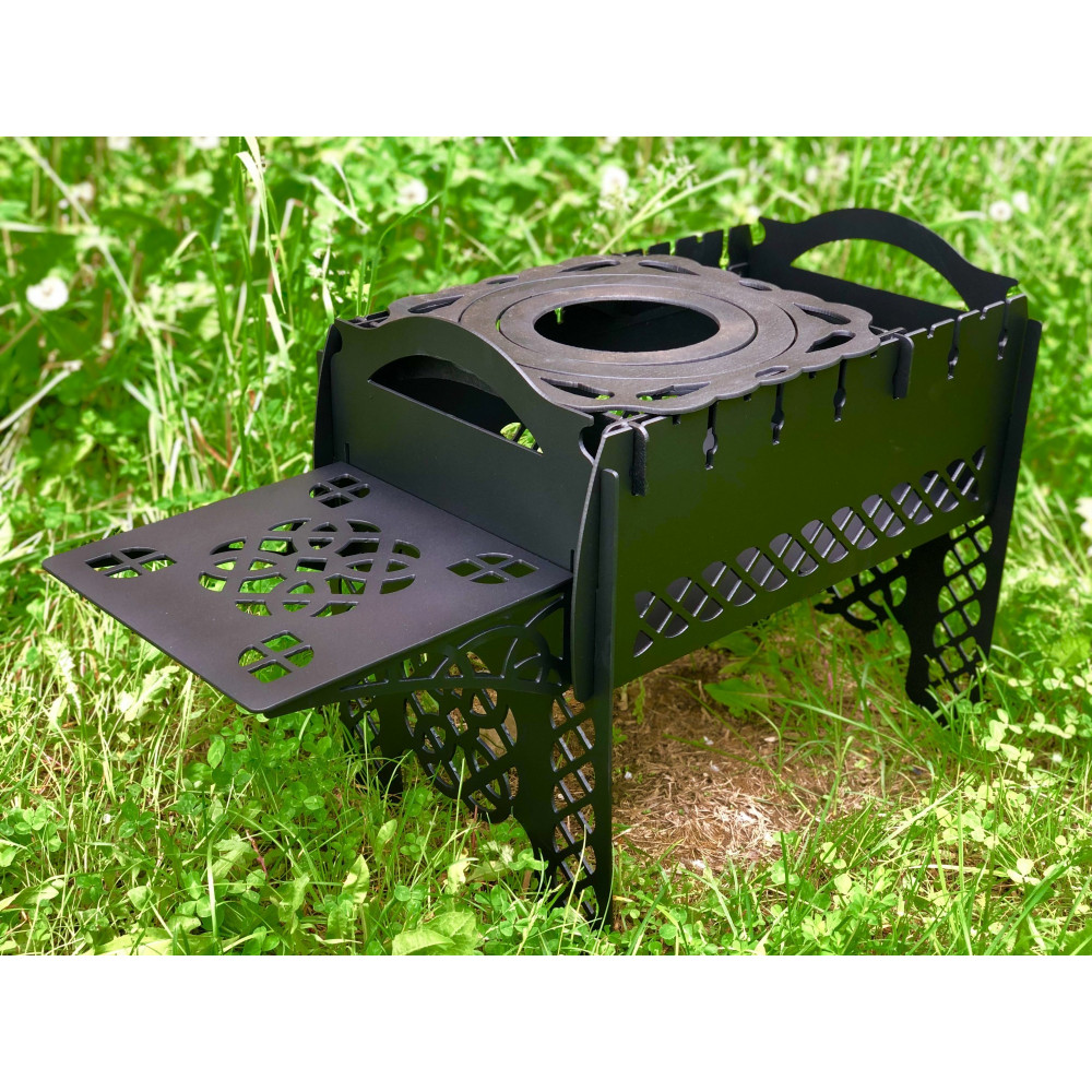 Мангал укомплектований підставкою під казан і знімним столиком.