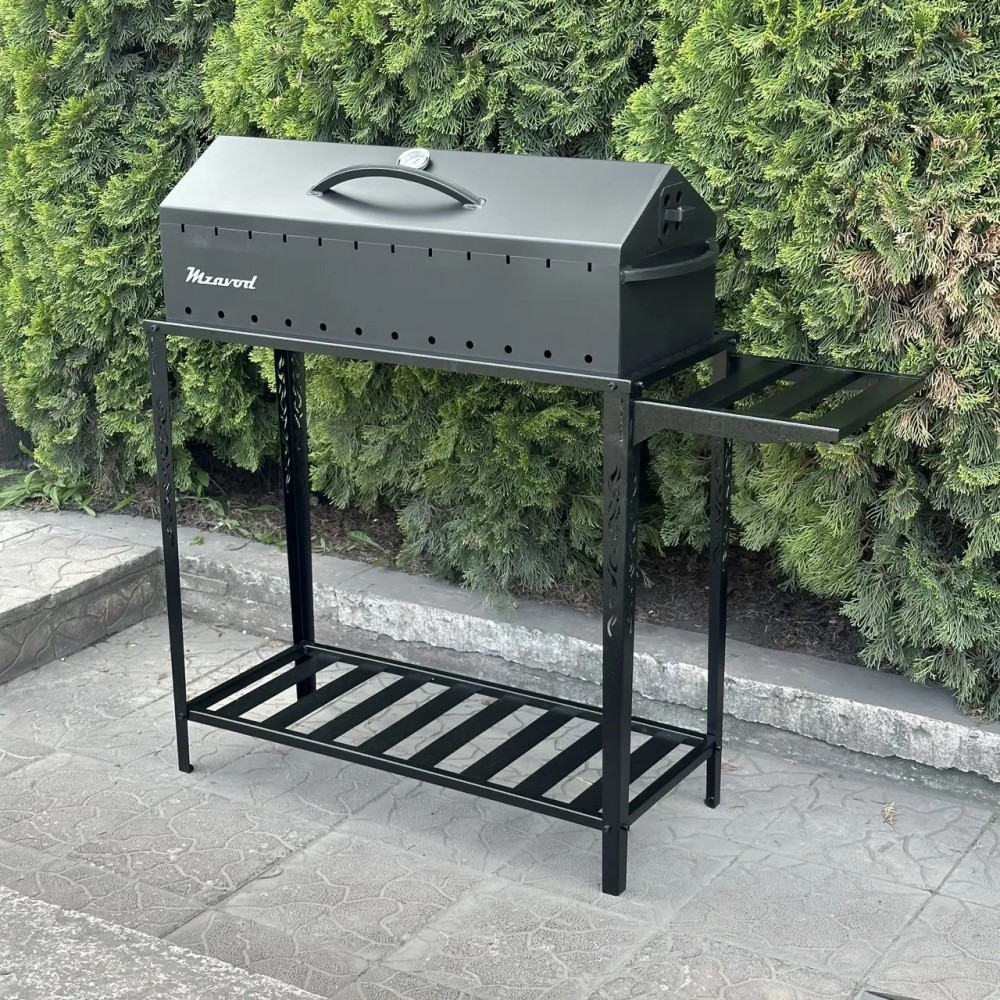 Комплект поставки: жаровня-барбекю з термометром, розбірна дровниця, знімна бокова поличка - 1шт, металева решітка гриль - 1 шт