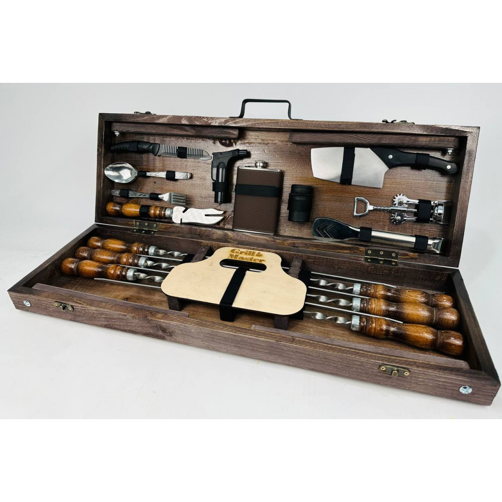 Комплектація: шампура, виделка для зняття м'яса, ніж-сікач, щипці-гриль, ніж, штопор, чарки 6 шт, фляга, запальничка, виделки 6 шт, ложки 6 шт, опахало для вугілля