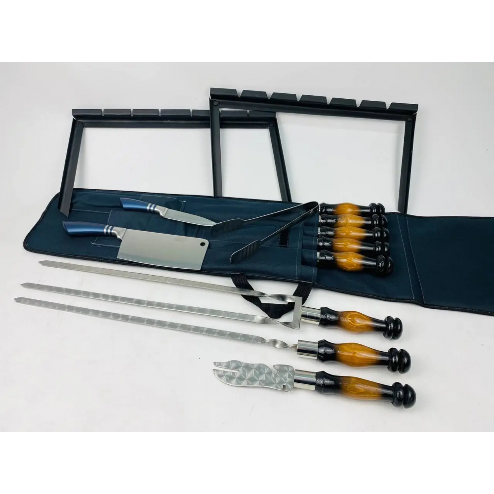 Комплектація: шампура, подвійний шампур, виделка для зняття м'яса, ніж-сікач, ніж, щипці-гриль, мангал-підставка