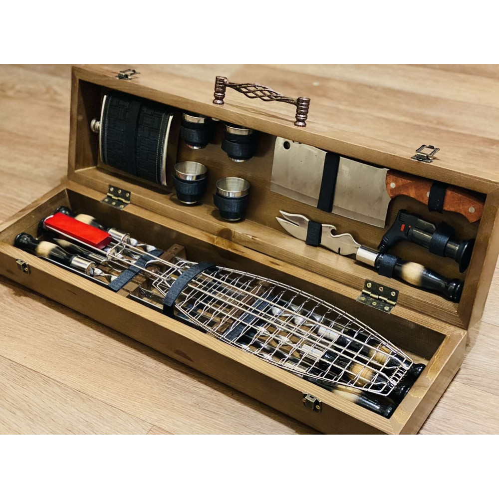 Такий набір шампурів створить WOW-ефект ще до його відкриття. Тільки побачивши дерев'яний кейс, майбутній володар набору отримає безмежний вибух захоплення і незабутніх емоцій.