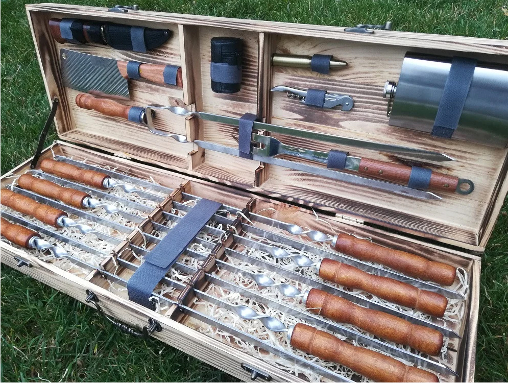 Подарунковий набір шампурів заповнений під зав'язку всім необхідним для приготування будь-якої страви на мангалі або грилі.
