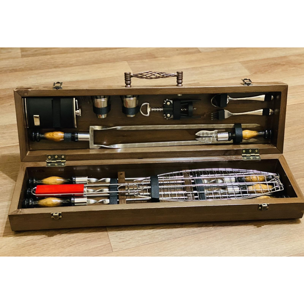 Шампура, решітка-гриль, подвійний шампур, вилка для зняття м'яса, фляга, чарки, вилки, ложки, штопор
