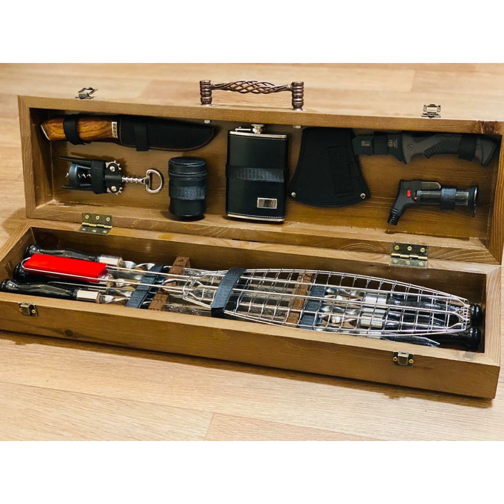 Такий набір шампурів створить WOW-ефект ще до його відкриття. Тільки побачивши дерев'яний кейс, майбутній володар набору отримає безмежний вибух захоплення і незабутніх емоцій.