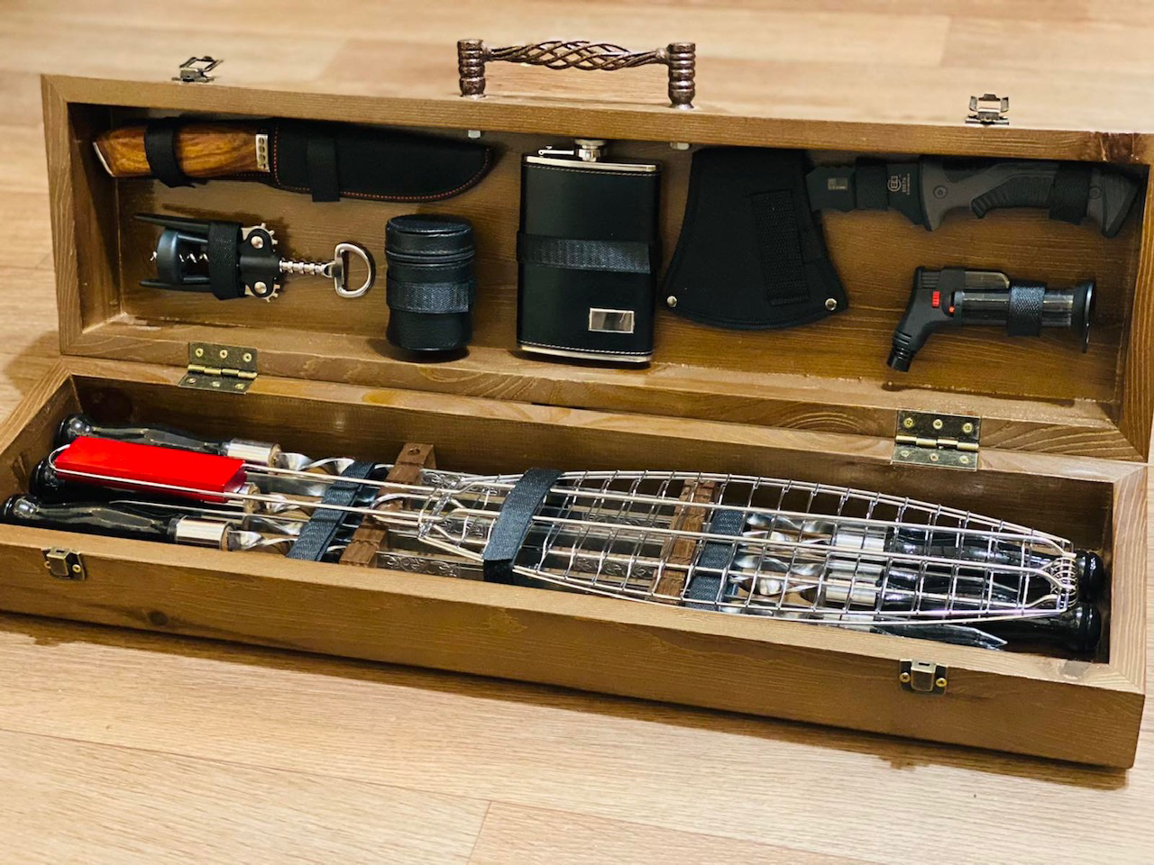 Шампура, решітка-гриль, сокира, ніж, фляга, чарки, запальничка, штопор