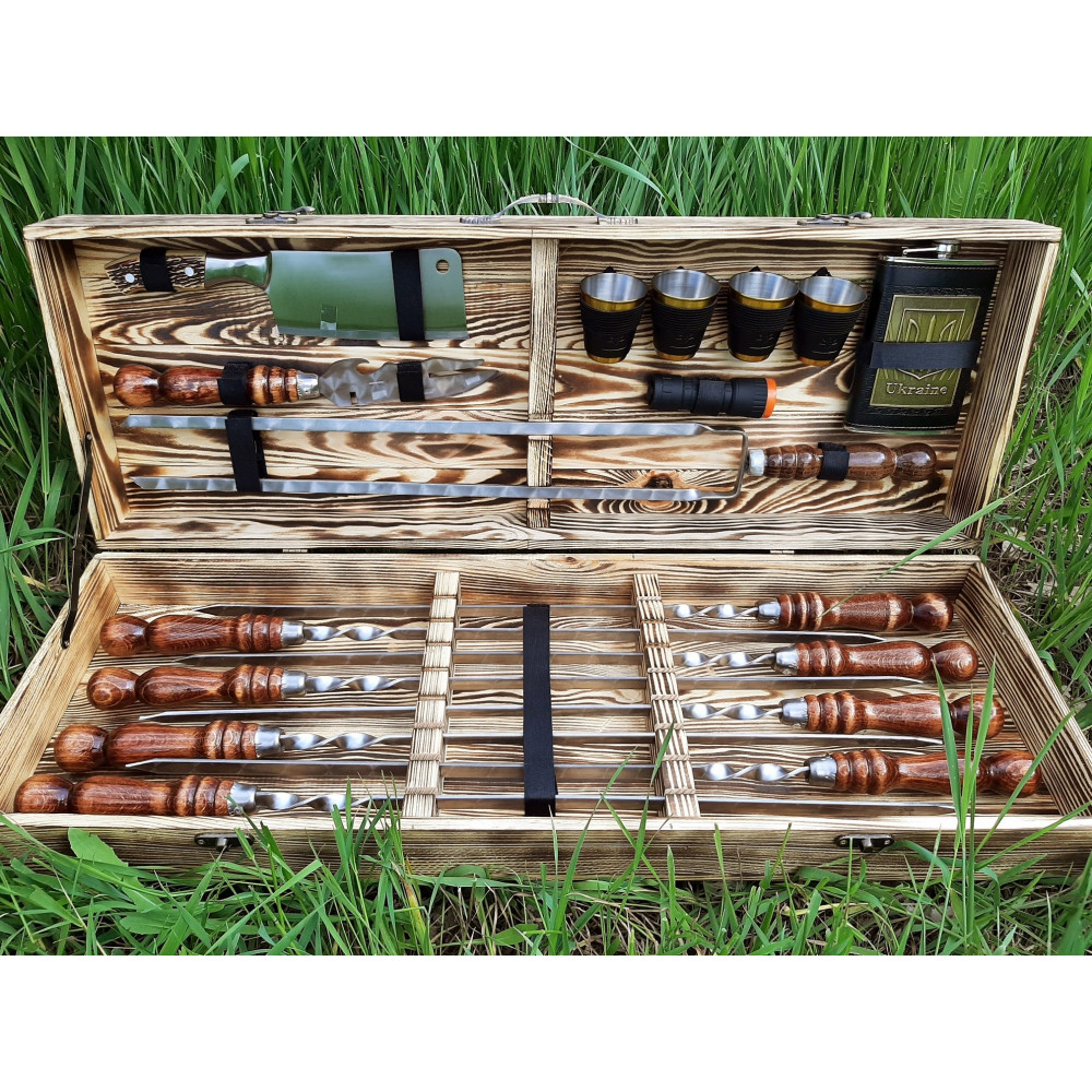 Шампура та аксесуари упаковані в дерев'яний кейс ручної роботи, що надає подарунку ще більшої цінності та преміальності.