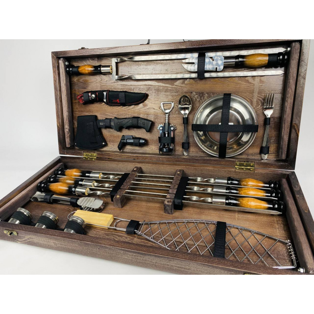 шампура, подвійний шампур, виделка для зняття м'яса, решітка-гриль, щипці-гриль, чарки 6 шт, ніж у чохлі, топірець, запальничка, штопор, виделки 6 шт, тарілки 6 шт, ложки 6 шт