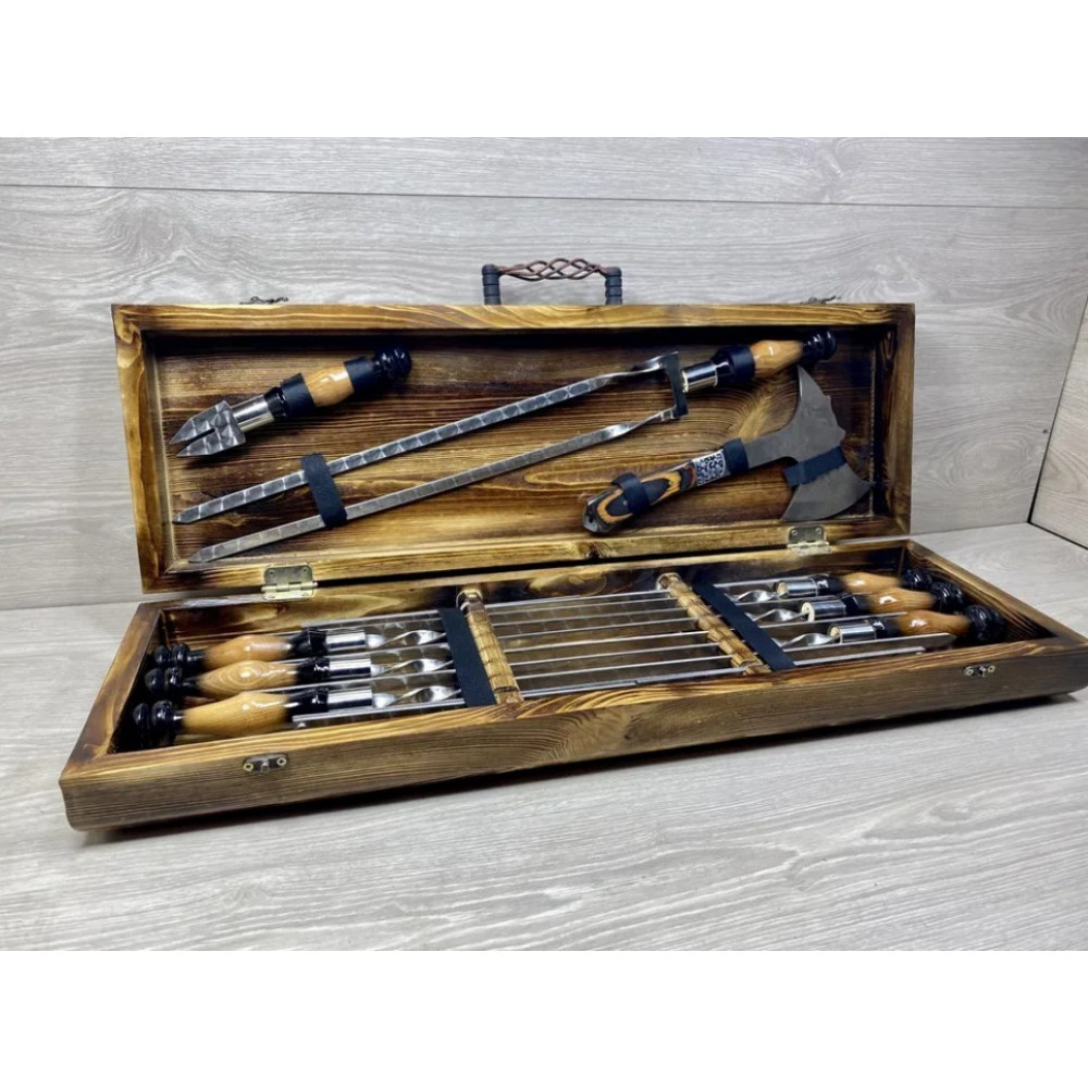 шампура, подвійний шампур, виделка для зняття м'яса, сокирка, мангал-підставка
