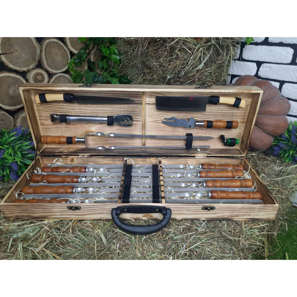 Презентабельний, тому що упакований в красивий дерев'яний кейс. Корисний, тому що максимально спростить приготування страв. Функціональний, тому що в кейсі є все необхідне для приготування різноманітних страв на мангалі або грилі.