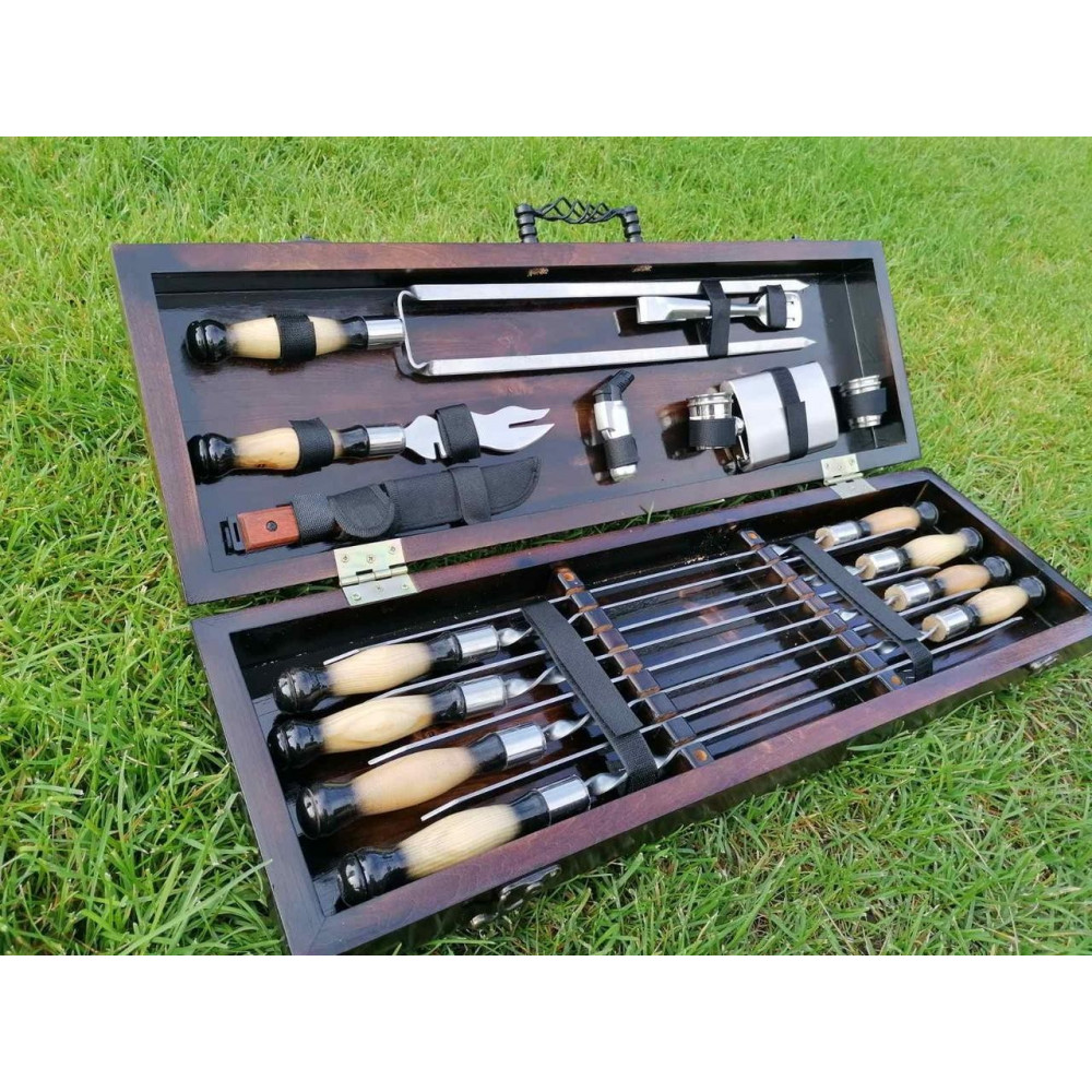 Презентабельний, тому що упакований в красивий дерев'яний кейс. Корисний, тому що максимально спростить приготування страв. Функціональний, тому що в кейсі є все необхідне для приготування різноманітних страв на мангалі або грилі.