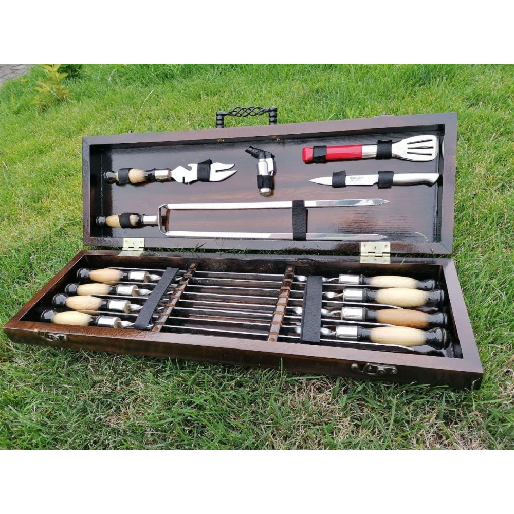 Презентабельний, тому що упакований в красивий дерев'яний кейс. Корисний, тому що максимально спростить приготування страв. Функціональний, тому що в кейсі є все необхідне для приготування різноманітних страв на мангалі або грилі.