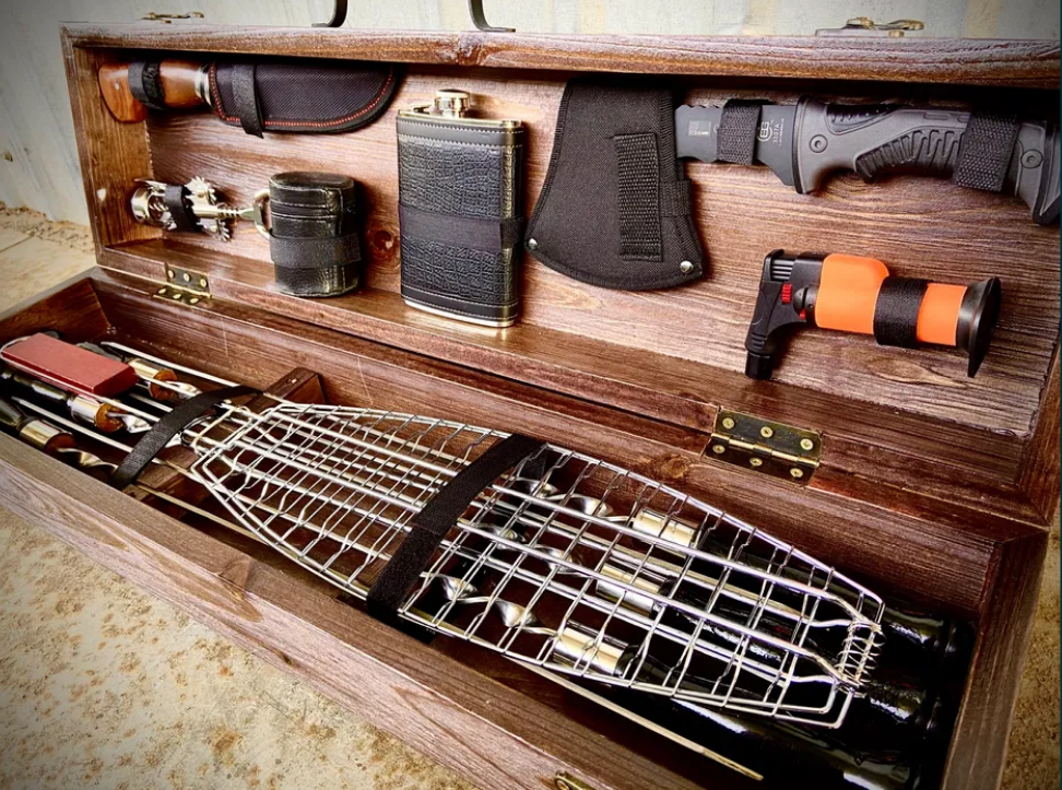 шампура, решітка-гриль, ніж, запальничка, фляга, чарки, штопор