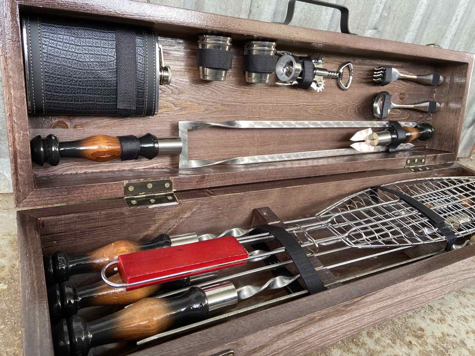 шампура, решітка-гриль, подвійний шампур, виделка для зняття м'яса, фляга, чарки, ложки, виделки, штопор