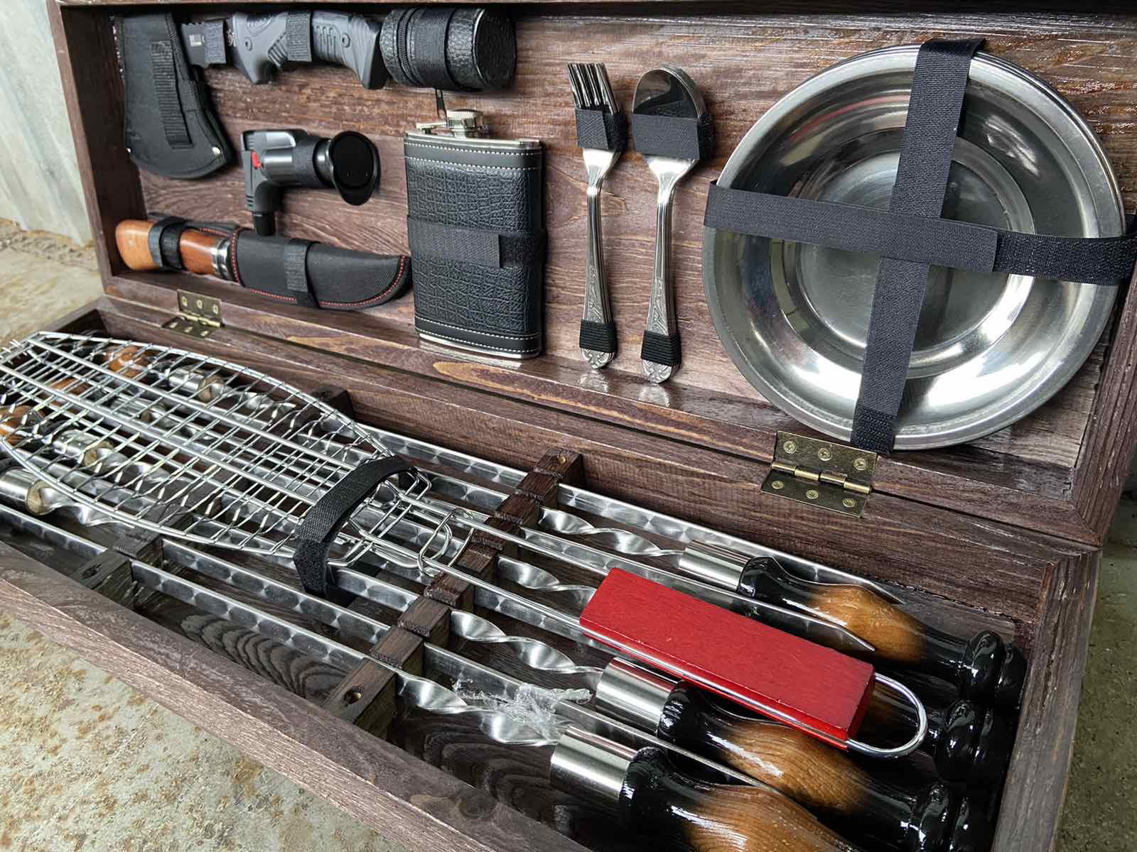 шампура, решітка-гриль, запальничка, ніж, сокира, фляга, чарки, ложки, виделки, тарілки