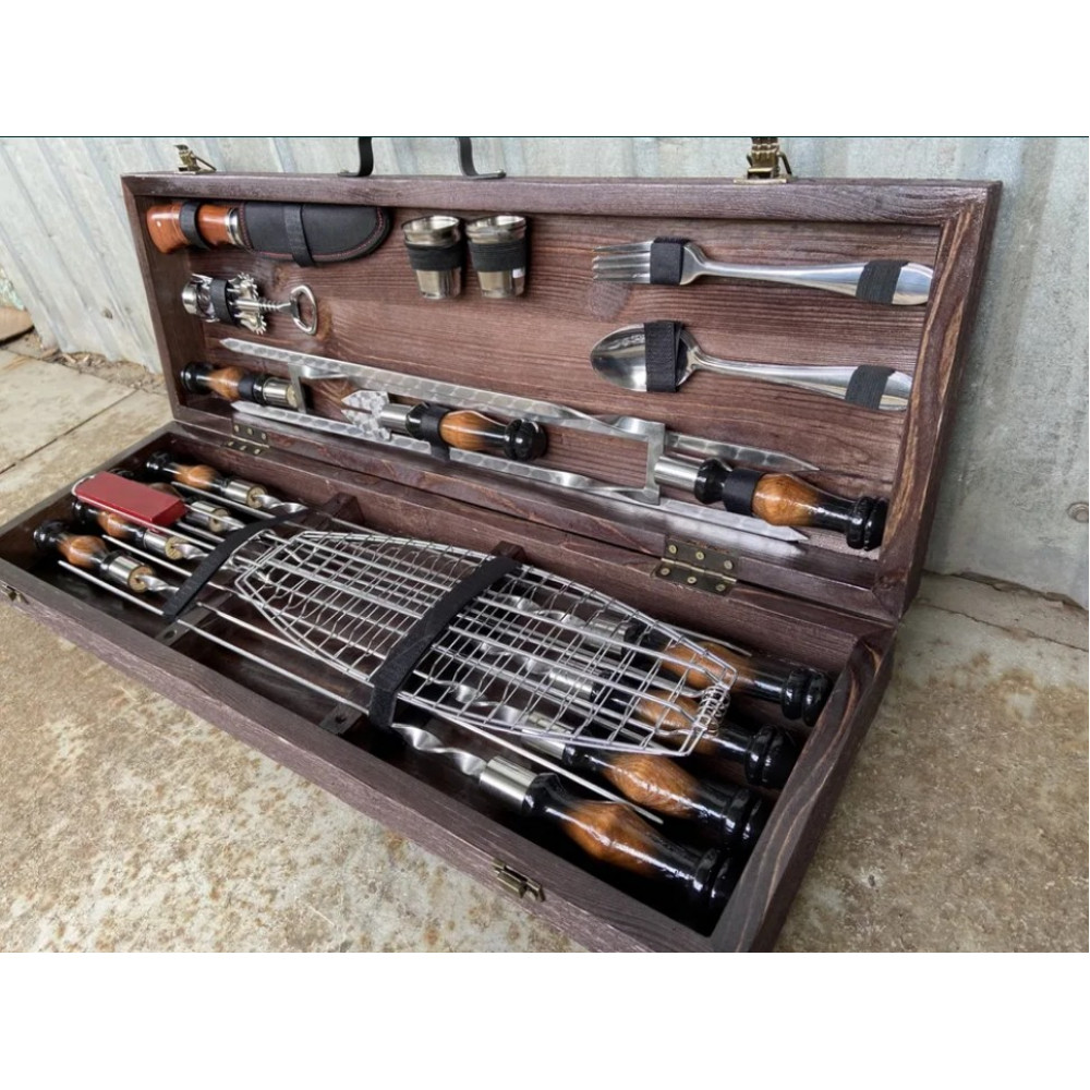 Набір шампурів упакований в презентабельний дерев'яний кейс, що надає такому подарунку ще більше преміальності.