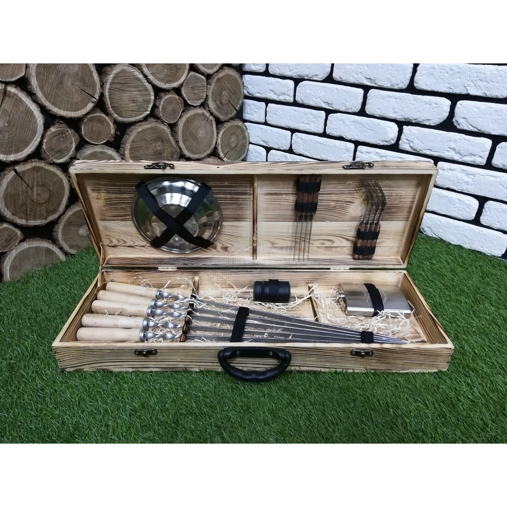 Презентабельний, тому що упакований в красивий дерев'яний кейс. Корисний, тому що максимально спростить приготування страв. Функціональний, тому що в кейсі є все необхідне для приготування різноманітних страв на мангалі або грилі.