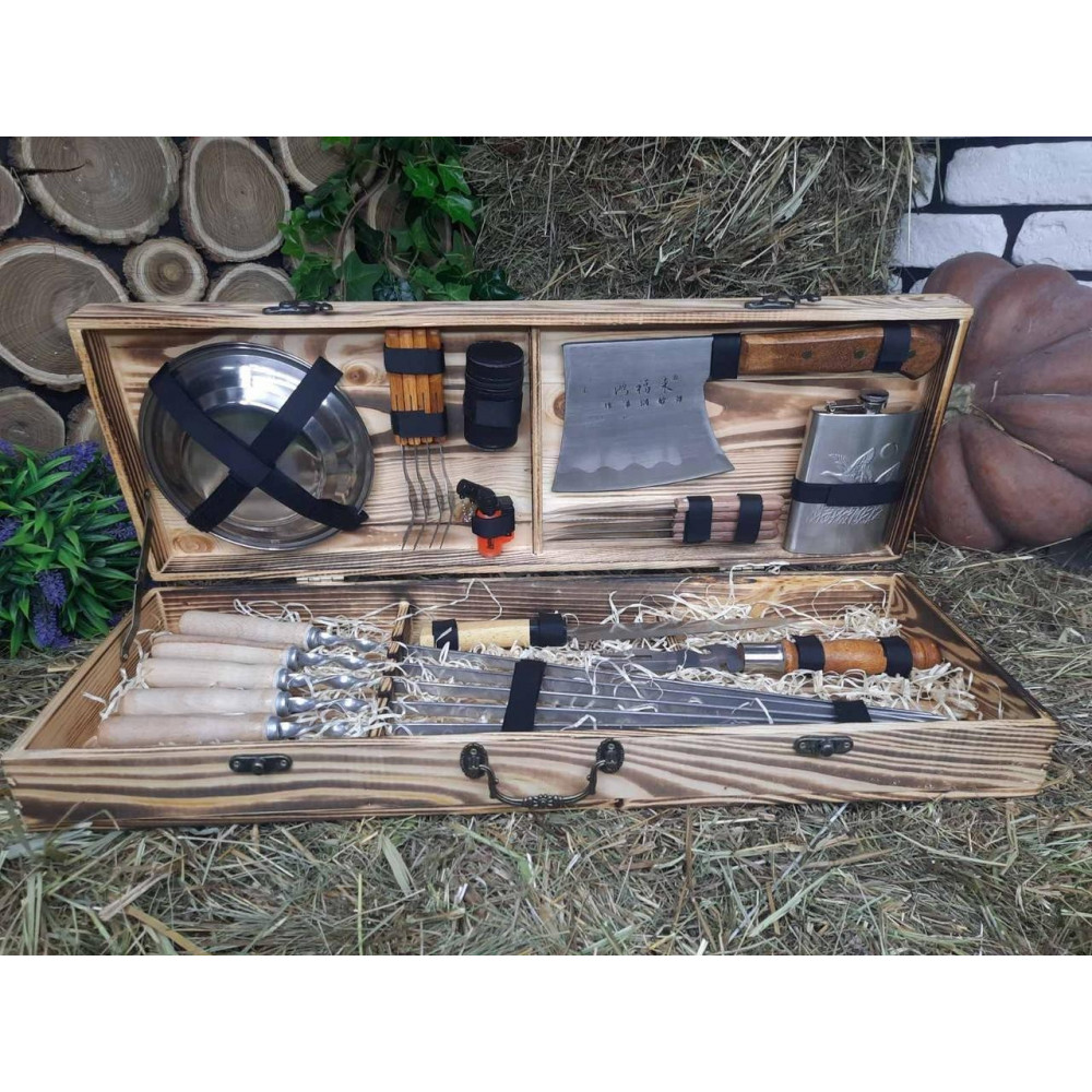 Презентабельний, тому що упакований в красивий дерев'яний кейс. Корисний, тому що максимально спростить приготування страв. Функціональний, тому що в кейсі є все необхідне для приготування різноманітних страв на мангалі або грилі.