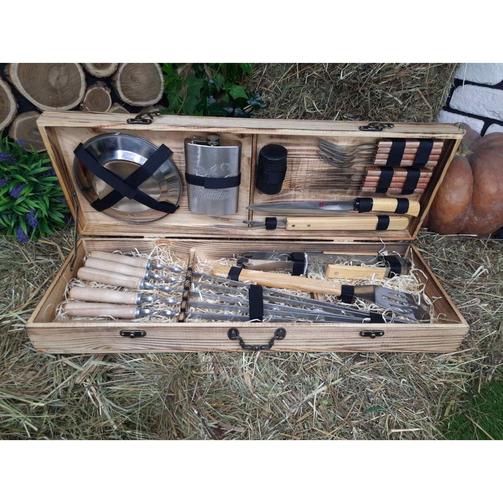 Презентабельний, тому що упакований в красивий дерев'яний кейс. Корисний, тому що максимально спростить приготування страв. Функціональний, тому що в кейсі є все необхідне для приготування різноманітних страв на мангалі або грилі.