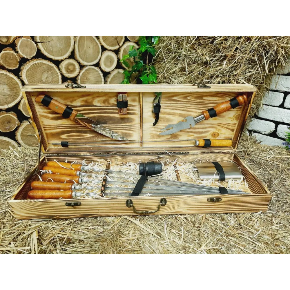 Подарунковий набір шамупров у дерев'яному кейсі - чудовий подарунок для любителя готувати на мангалі.