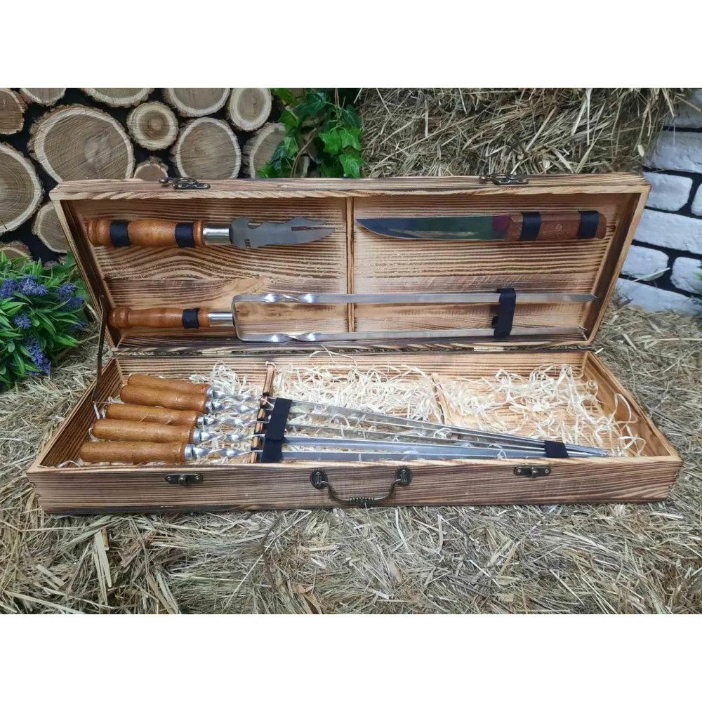 Подарунковий набір шампурів у дерев'яному кейсі - чудовий подарунок для любителя готувати на мангалі.