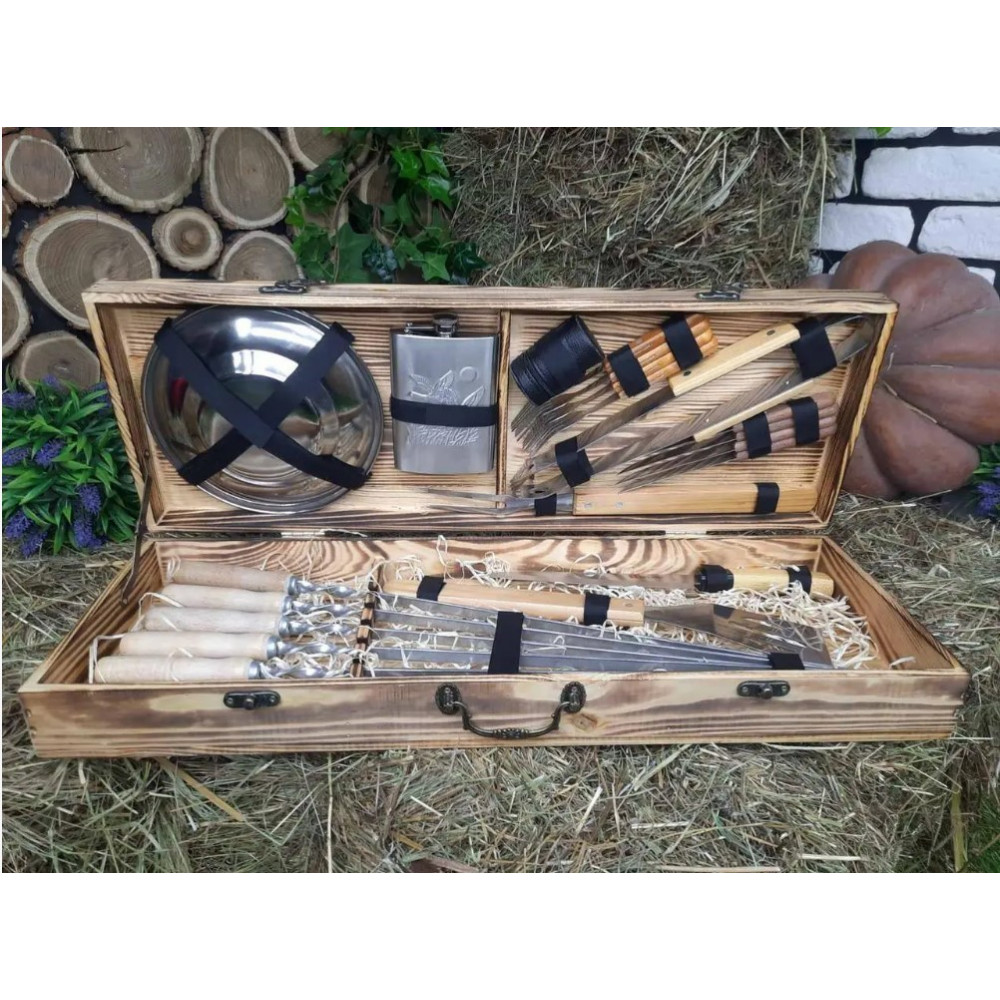 Презентабельний, бо упакований у гарний дерев'яний кейс. Корисний, тому що максимально спростить приготування страв. Функціональний, тому що в кейсі є все необхідне для виготовлення найрізноманітніших страв на мангалі або грилі.