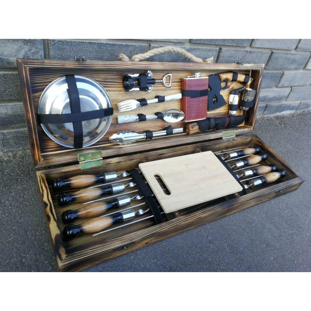 Презентабельний, тому що упакований в красивий дерев'яний кейс. Корисний, тому що максимально спростить приготування страв. Функціональний, тому що в кейсі є все необхідне для приготування різноманітних страв на мангалі або грилі.
