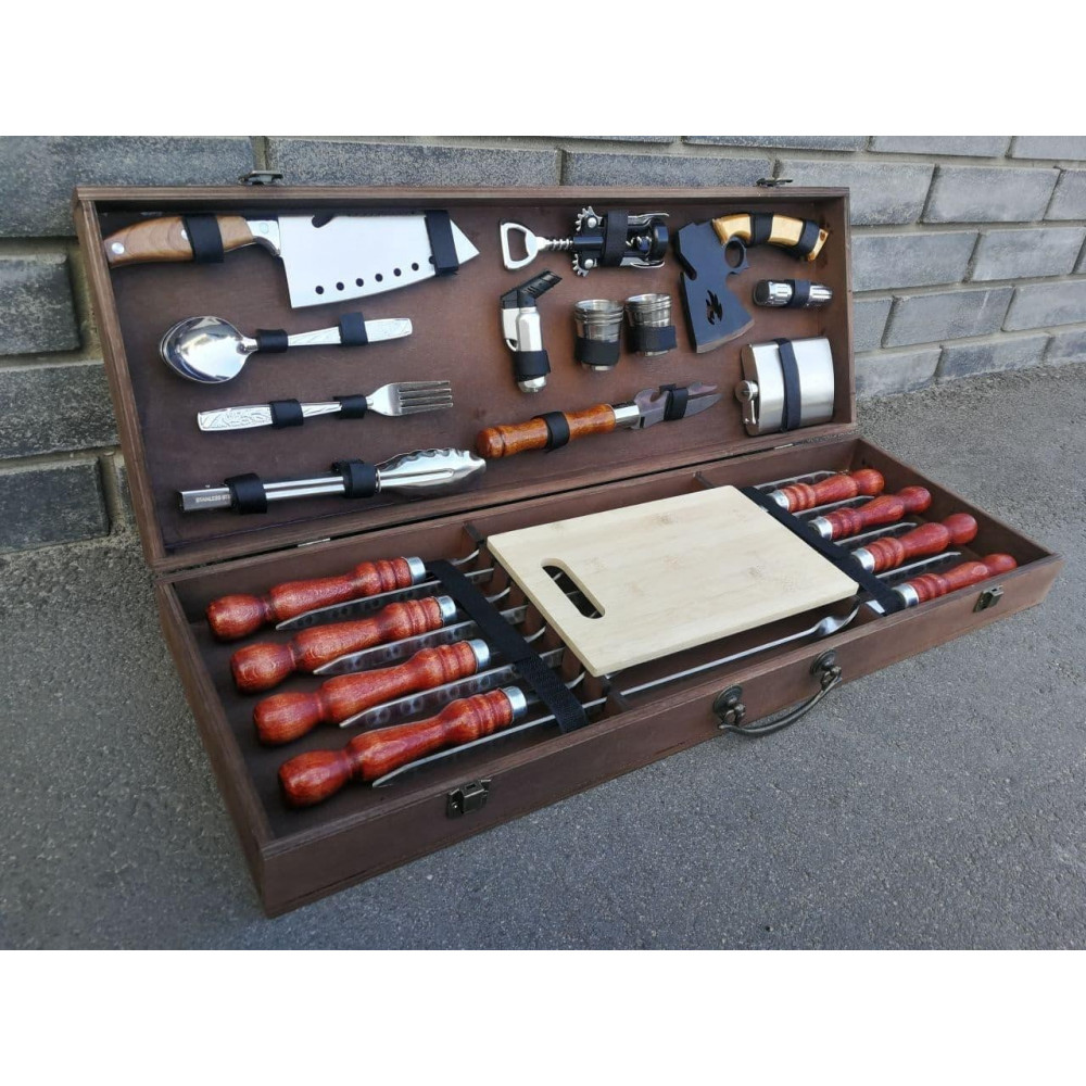 Презентабельний, тому що упакований в красивий дерев'яний кейс. Корисний, тому що максимально спростить приготування страв. Функціональний, тому що в кейсі є все необхідне для приготування різноманітних страв на мангалі або грилі.