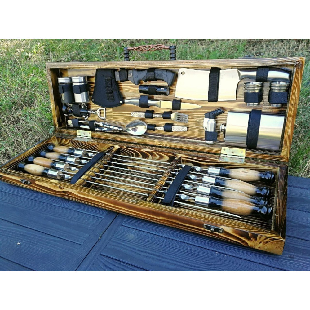 Презентабельний, тому що упакований в красивий дерев'яний кейс. Корисний, тому що максимально спростить приготування страв. Функціональний, тому що в кейсі є все необхідне для приготування різноманітних страв на мангалі або грилі.
