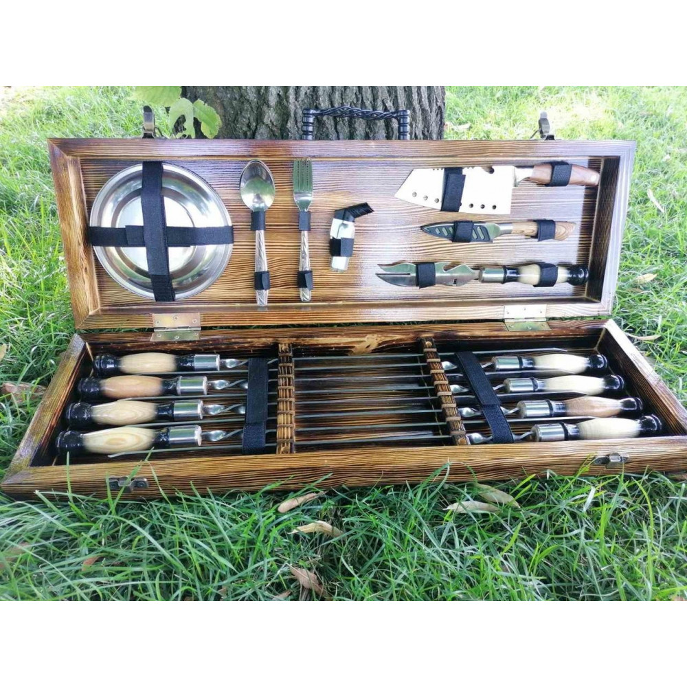 Презентабельный, потому что упакован в красивый деревянный кейс. Полезный, потому что максимально упрости приготовление блюд. Функциональный, потому что в кейсе есть все необходимое для приготовления самых разнообразных блюд на мангале или гриле.
