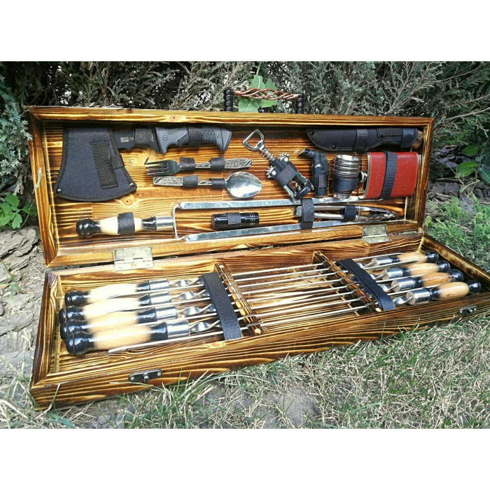 Презентабельний, тому що упакований в красивий дерев'яний кейс. Корисний, тому що максимально спростить приготування страв. Функціональний, тому що в кейсі є все необхідне для приготування різноманітних страв на мангалі або грилі.