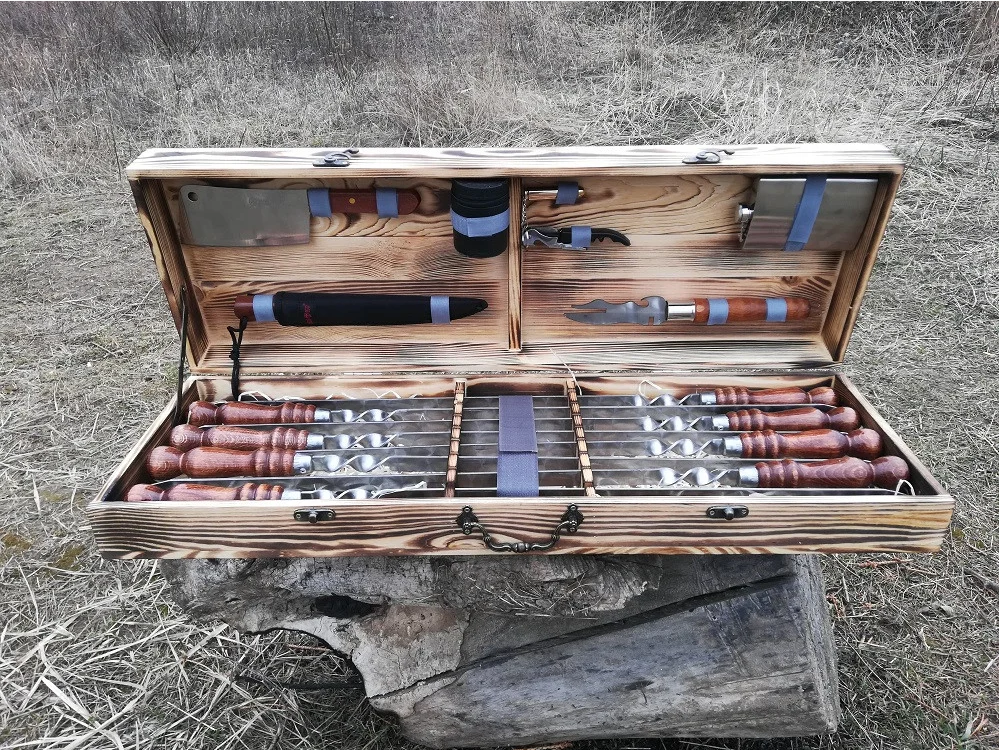 У наборі зібрано все необхідне для приготування різноманітних страв на мангалі або грилі.