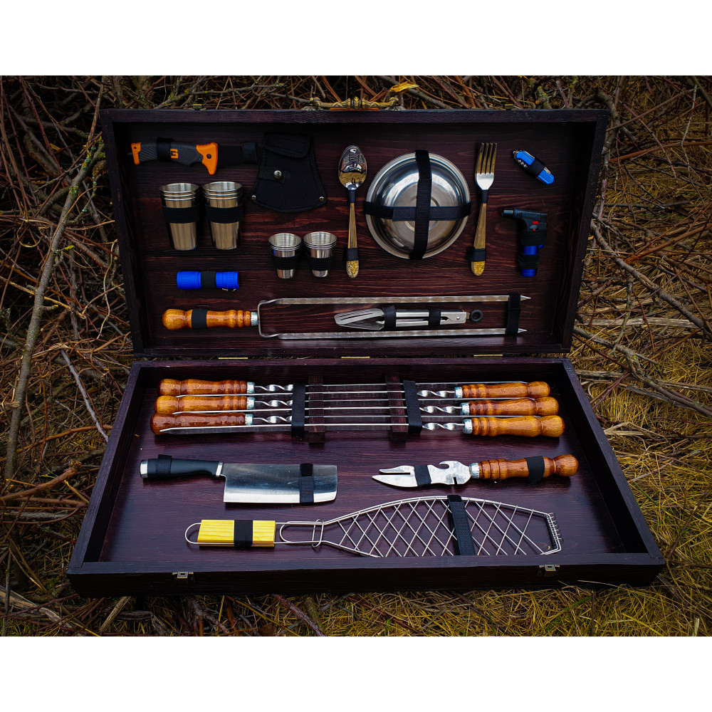 6 шампурів з нержавіючої сталі (товщина 3 мм), ніж-сікач, виделка для зняття м'яса, решітка-гриль, подвійний шампур, щипці-гриль, ліхтарик, сокирка, 6 чарок, 6 склянок, 6 виделок, 6 ложок, 6 мисок, мультитул, запальничка