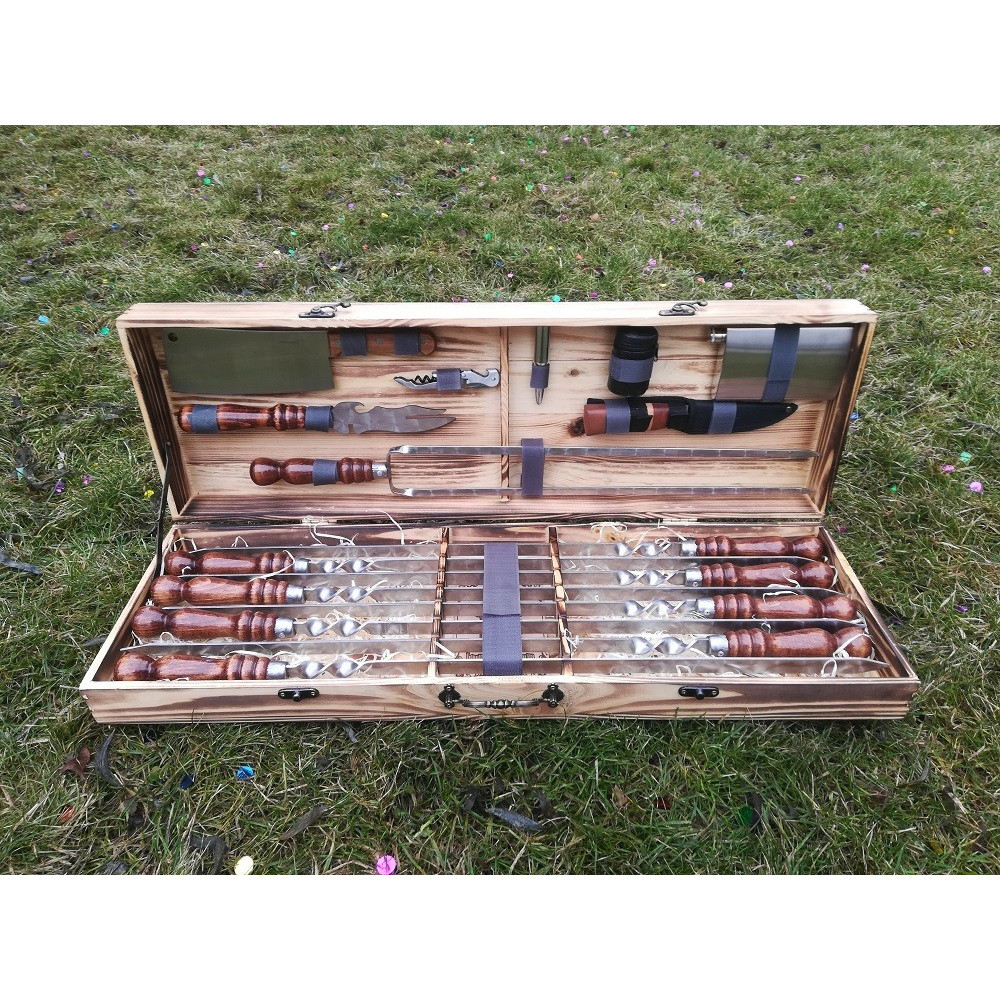 Подарунковий набір шашлика заповнений під зав'язку всім необхідним для приготування будь-якої страви на мангалі або грилі.