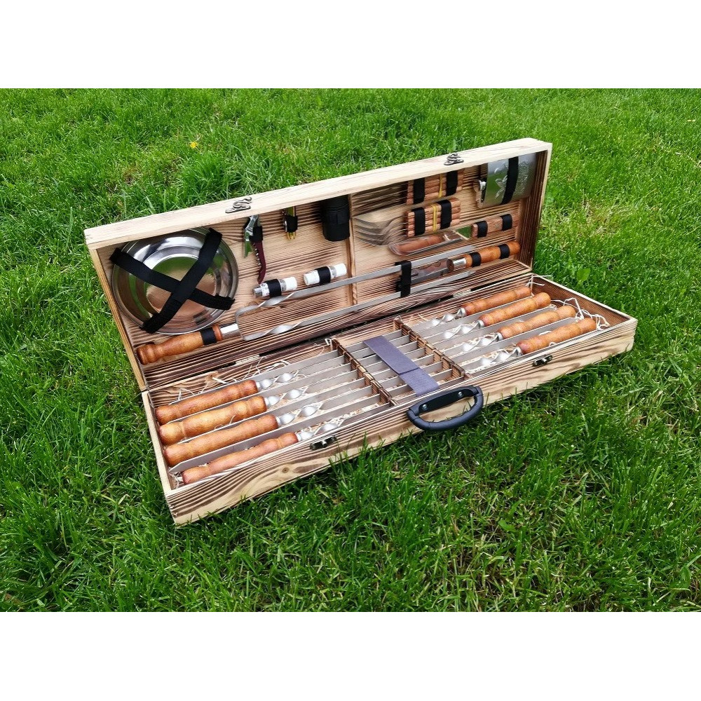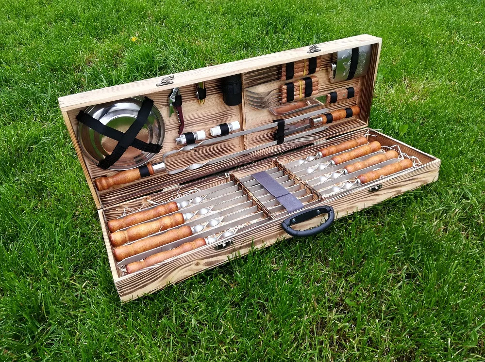 Подарунковий набір шампурів заповнений під зав'язку всім необхідним для приготування будь-якої страви на мангалі або грилі.