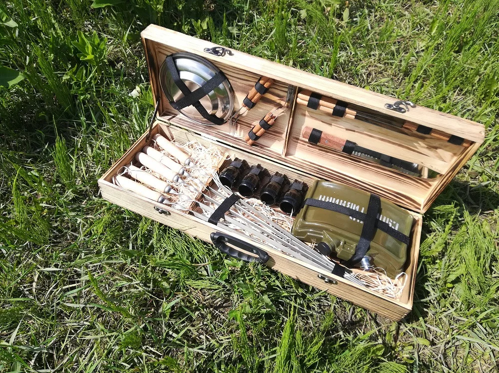 Шампура і аксесуари упаковані в дерев'яний кейс ручної роботи, що надає подарунку ще більшу цінність і преміальність.