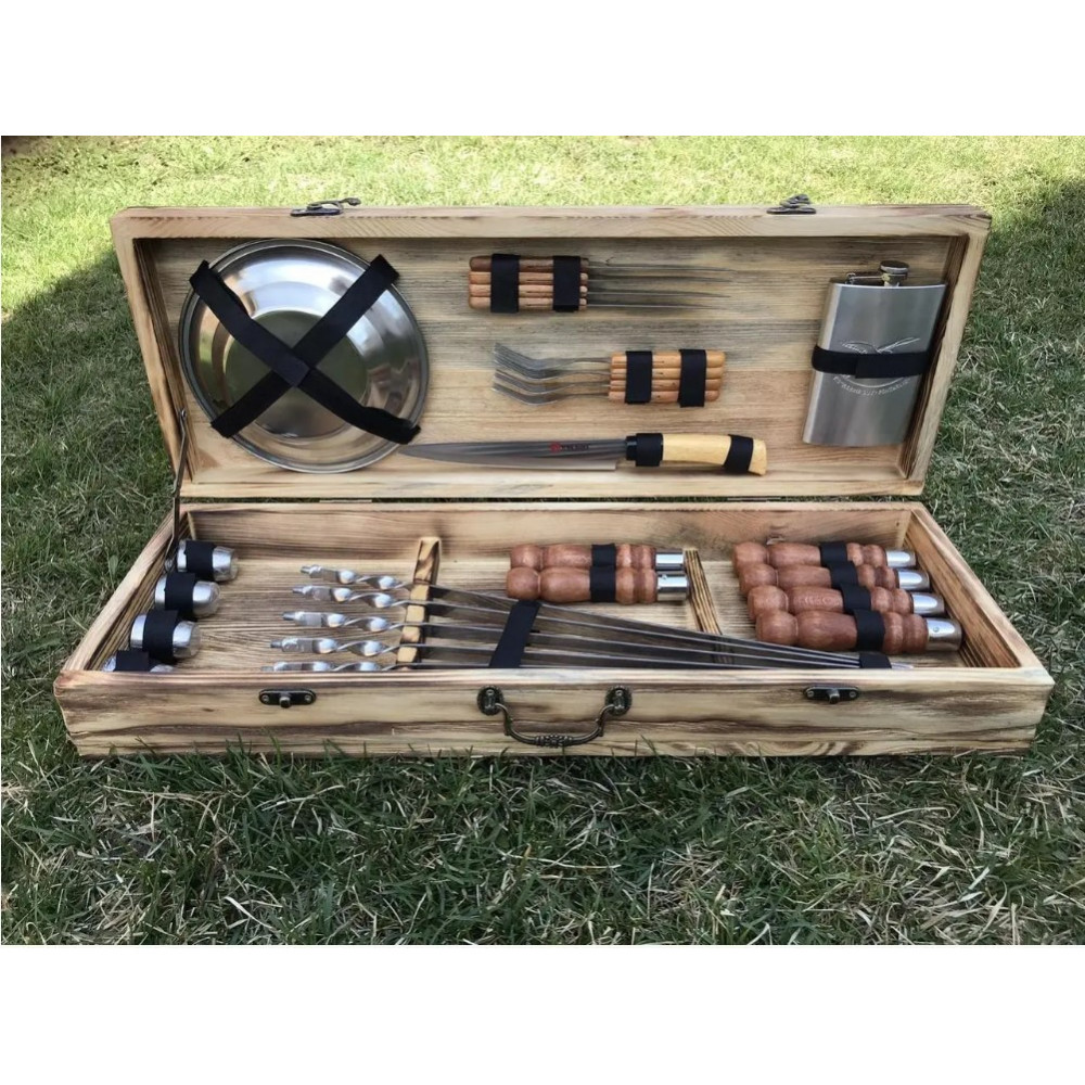 шампура, ніж, виделки, чарки, тарілки, ножі. фляга